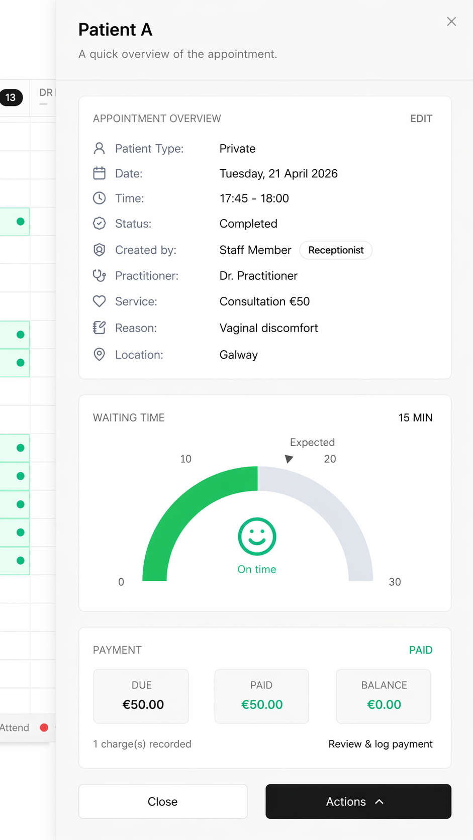 Run scheduled appointments, walk-ins, patient requests, practitioner swimlanes, and care handoffs from one screen shared by reception, operations, and practitioners.